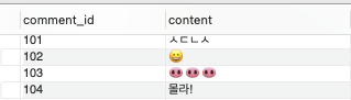 utf8 경우 😀. 😃. 😄. 😁. 😆. 😅. 🤣. 😂. 🙂. 🙃. 😉. 😊. 😇. 같은 이모지를 지원하지 않는다.