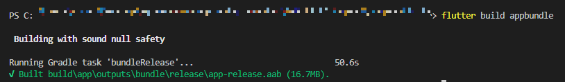 성공적으로 생성이 완료 되었고 해당 프로젝트 폴더에 build\app\outputs\bundle\release에 app-release.aab 이 있다.